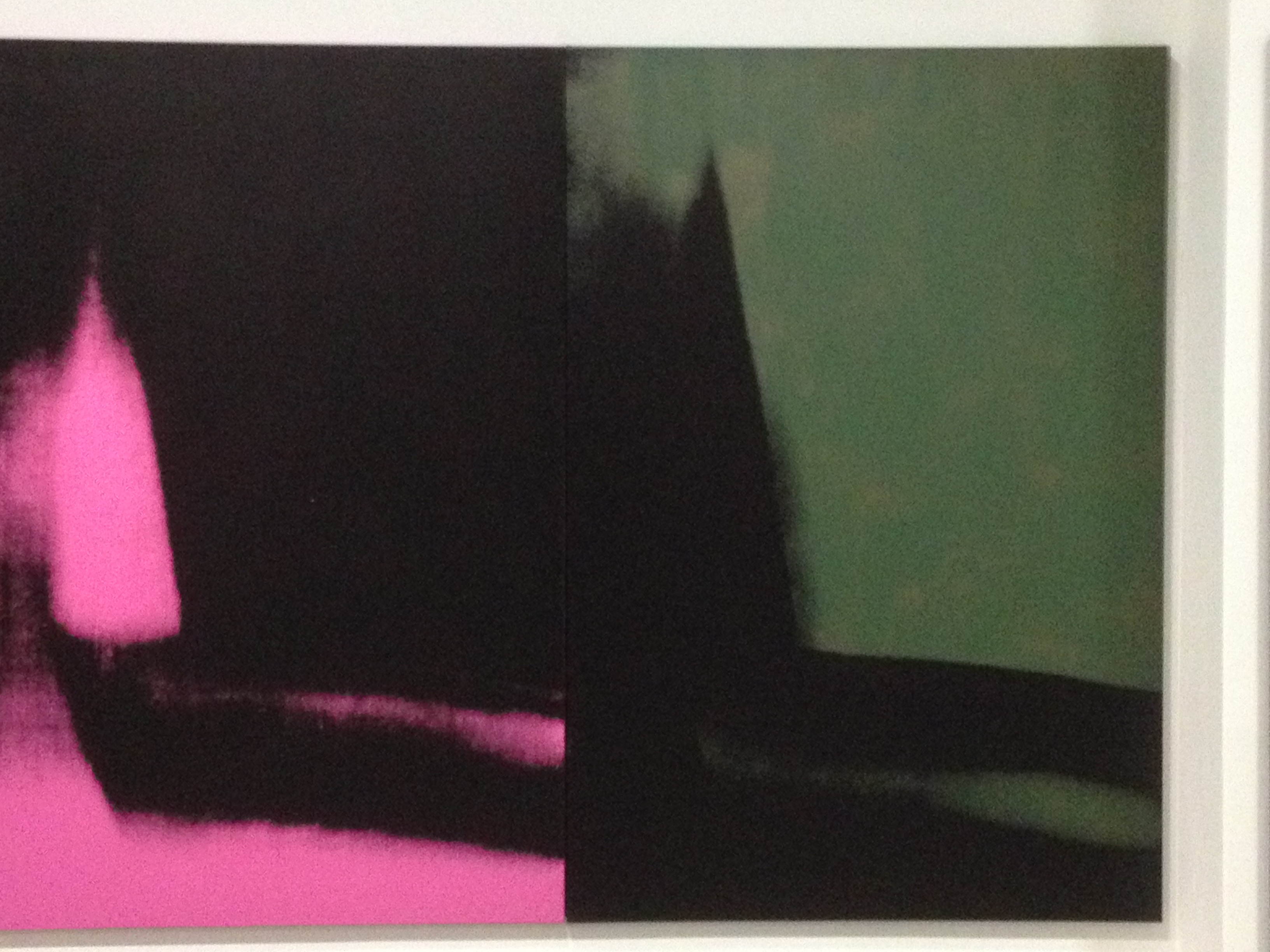 On pourra jouir même d’un paradoxe stimulant car parallèlement à cette primeur, le visiteur aura la possibilité de comparer plusieurs suites composées avant les Ombres, entre autres: Flowers (1964-65), Electric Chair (1964-67), Mao (1972-73). Surprise, le fétichiste de la matérialité à tout crin, l’adulateur des surfaces tangibles, l’amoureux des objets cernables se penche, curieuse affaire, sur des figures abstraites. Bien sûr, interrogé à ce sujet, Andy Warhol s’en sort par ses pirouettes habituelles, la pièce à son avis tiendrait le coup du fait qu’elle est simplement démesurée. Une question de taille dont le contenu au plus pourrait servir de fond de scène à une boite disco, un pur décor en somme. Pourtant ce travail soi disant décoratif voire marginal n’a rien d’insignifiant. Les 102 sérigraphies présentées bord à bord (193 x 132 cm chacune) ont été réalisées à partir de photos reproduisant la combinaison des ombres portés d’une maquette de papier mâché fabriquée pour l’occasion. A quelques exceptions près, on a une alternance de grandes formes noires se détachant sur un fond en couleurs et de formes colorées plus petites qui semblent se dégager d’un arrière plan noir. Les couleurs utilisées du vert électrique au marron sombre apportent un rythme inexistant sur les photos d’origine. Sans oublier ça et là des coups de pinceau apportant une touche gestuelle au mode d’impression. Plus intrigant encore, chaque toile n’est qu’un reflet de la maquette de départ et chaque « original » de la série comme le remarque l’historien d’art V. Stoichita est déjà une reproduction. Nous sommes dans le chemin des ombres, dans ce mythe des débuts de la peinture qui vit le premier peintre résoudre l’absence de l’être aimé en traçant les contours de l’ombre portée de sa silhouette. Cette répétition de l’absence ne serait-elle pas au cœur de la méthode Warhol ? Alors, hypothèse réjouissante, les séries de Warhol au lieu de célébrer le triomphe de la société de consommation annonceraient plutôt son progressif effacement via la multiplication effrénée des sérigraphies. Une histoire finalement pas si insipide que ça.