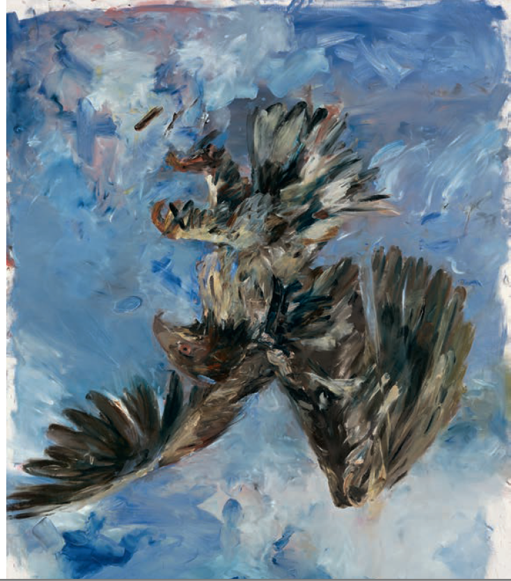 Cette toile de prime abord intrigue. Elle happe l’œil, mais on hésite. Sait-on bien ce que l’on regarde. Elle vous frappe, vous êtes saisi. Elle vous trouble et vous êtes encore plus attiré. Une masse de plume s’abat devant vous, dans le bleu du ciel, telle une figure convulsée, emmêlée dans les rémiges, serres et bec confondus. Or sa position dans l’espace apparaît contrariée. Le haut et le bas n’occupent pas les places habituelles et nous voilà désorientés. Son titre annonce un aigle mais ça n’arrange en rien notre affaire. Le doute persiste. Nous sommes comme l’oiseau en chute libre, nos perceptions déplacées, mises en déroute. Au carrefour des interrogations, ce tableau de Georg Baselitz, né en 1938 en Saxe, s’inscrit dans le cycle des peintures inversées initié en 1969. Elles sont à la lettre peintes à l’envers non pour créer un effet de style mais parce que le peintre justement n’a eu de cesse de se débarrasser des conventions, et en priorité de celle qui concerne la ressemblance par rapport au motif peint qu’il va justement mettre encore plus à mal en peignant avec les doigts. Un rejet viscéral de tous les ordres, de toutes les hiérarchies de la part de celui qui, enfant durant la guerre, a connu les villes allemandes en flammes. D’où son refus de toute autorité, de tout étendard, ici appliqué à cet aigle, le symbole par excellence de la nation allemande. Or rien n’est aussi simple. Le rapace certes tombe à la renverse, mais nous nous n’en avons pas encore fini puisque son mouvement reste ambigu. Du fait de l’inversion de l’image, l’oiseau de proie reste au milieu du gué entre sa déchéance probable et son éventuelle ascension. Comme quoi, il s’agit avant tout de creuser les incertitudes de l’art. Bref, voilà le combat de sa peinture : l’inverser, la malmener, la détruire pour la faire constamment renaître.